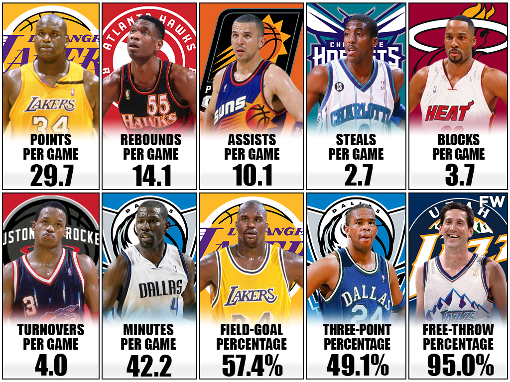 Only the best players can lead the NBA in per-game stats. It’s a hard task to accomplish. During the 1999-2000 season, the Los Angeles Lakers had the best basketball player in the world. Shaquille O’Neal won the MVP after a stellar season that saw him rank near the top in points, rebounds, blocks, and field-goal percentage. By the end of the season, O’Neal didn’t just win the regular season MVP, but also the Finals MVP.
