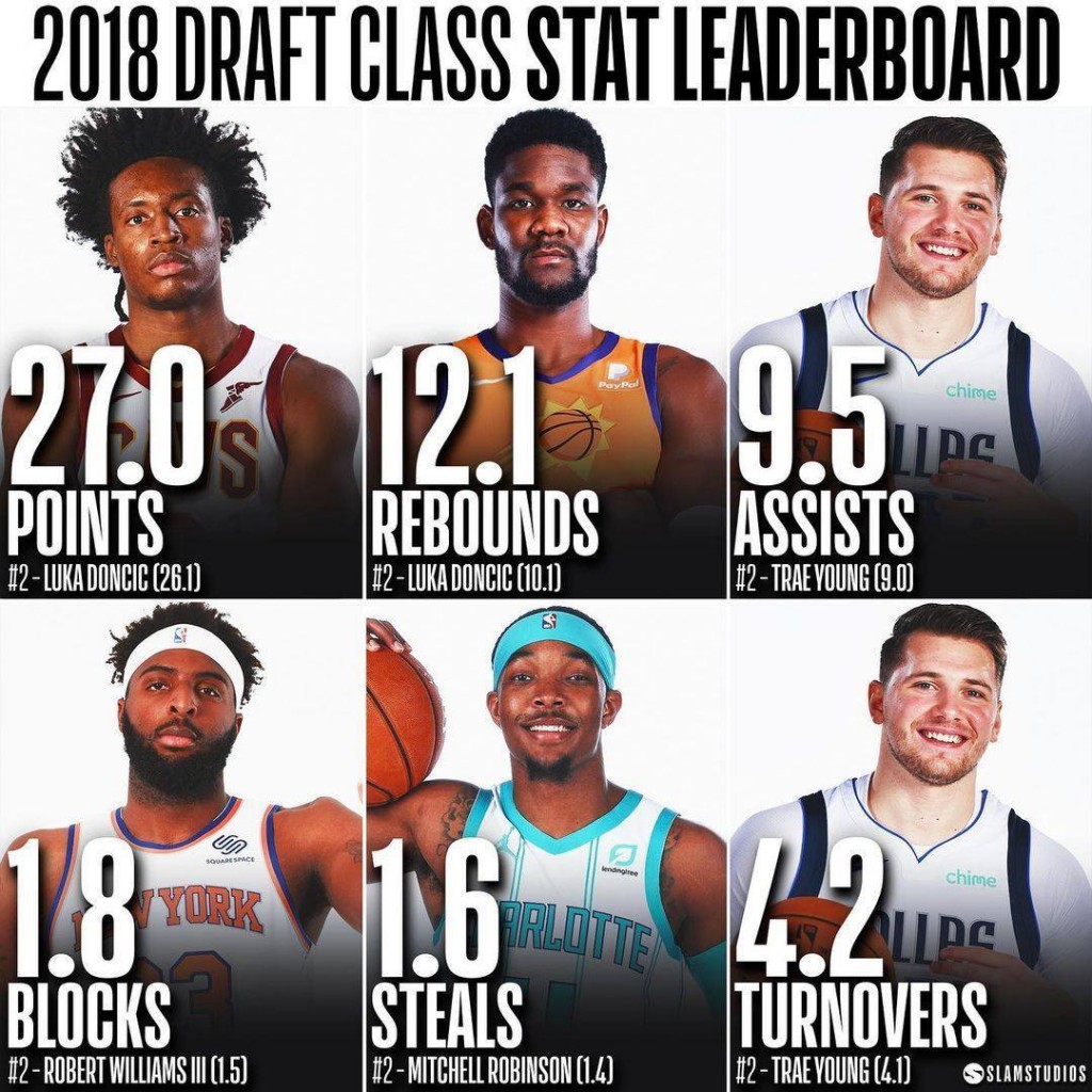 Deandre Ayton, the No. 1 overall pick that night, is a rebounding machine right now, averaging 12.1 per outing. Curiously, he’s followed by Doncic (10.1), a point guard and not a big man like Ayton. The Slovenian player is the assist leader of his class, dishing 9.5 dimes per game, followed by Trae Young with 9.0