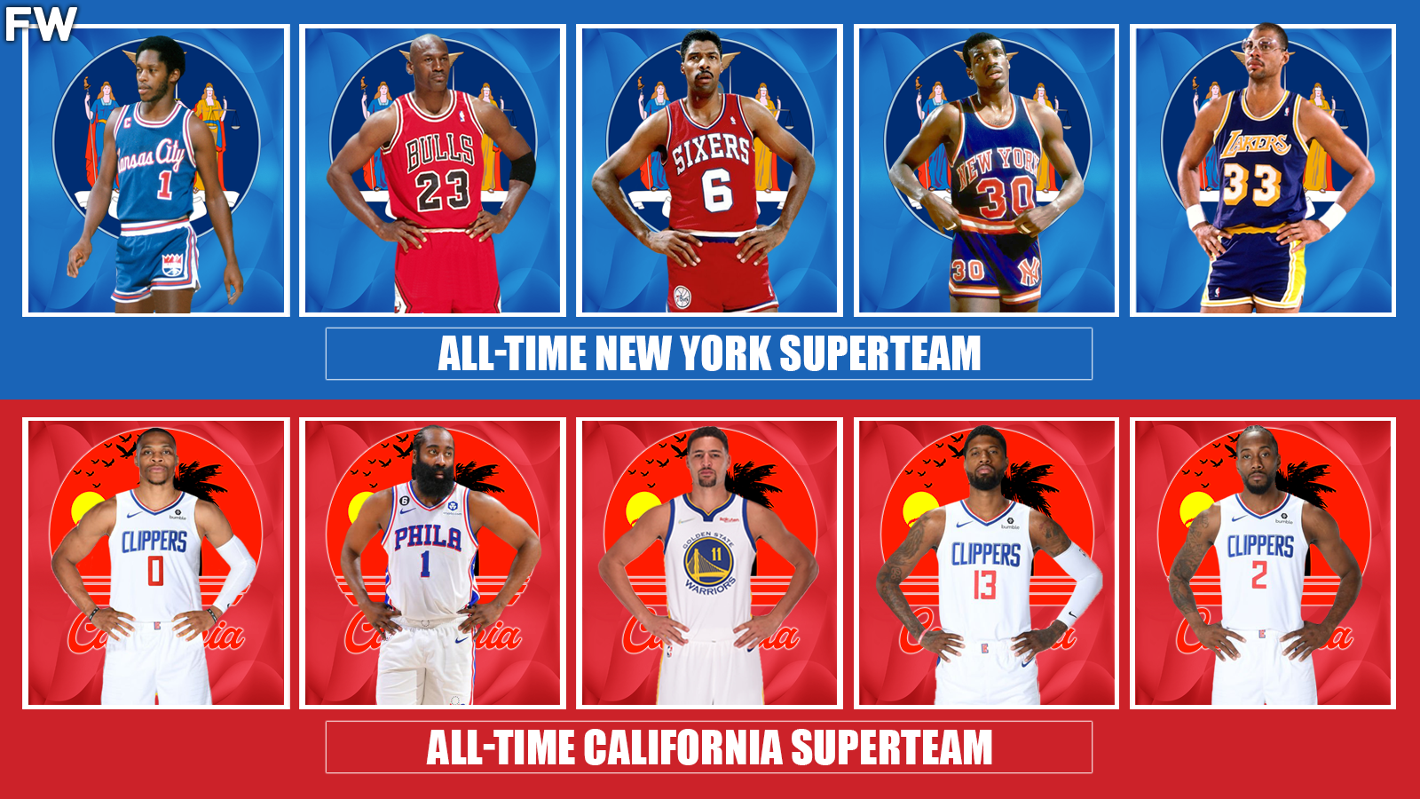 If we took the five best players from both New York and California, those would be some superteams that would create their very own dynasties. For this sake, it’s a great hypothetical matchup. To qualify for each state, the player must be born in a city that came from that state. From there, we made an All-Time New York and All-Time California lineup that would be tough to beat.