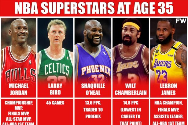NBA Superstars At Age 35: Michael Jordan Champion, LeBron James NBA Finals, Larry Bird 45 Games, Shaq O’Neal 13.6 PPG, Wilt Chamberlain 14.8 PPG