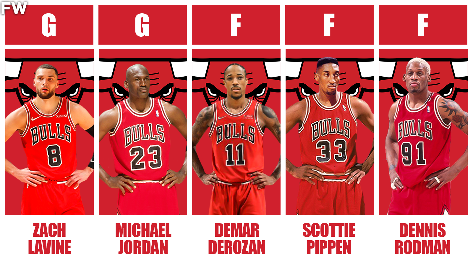 Michael Jordan, Zach LaVine, DeMar DeRozan, Scottie Pippen, Dennis Rodman