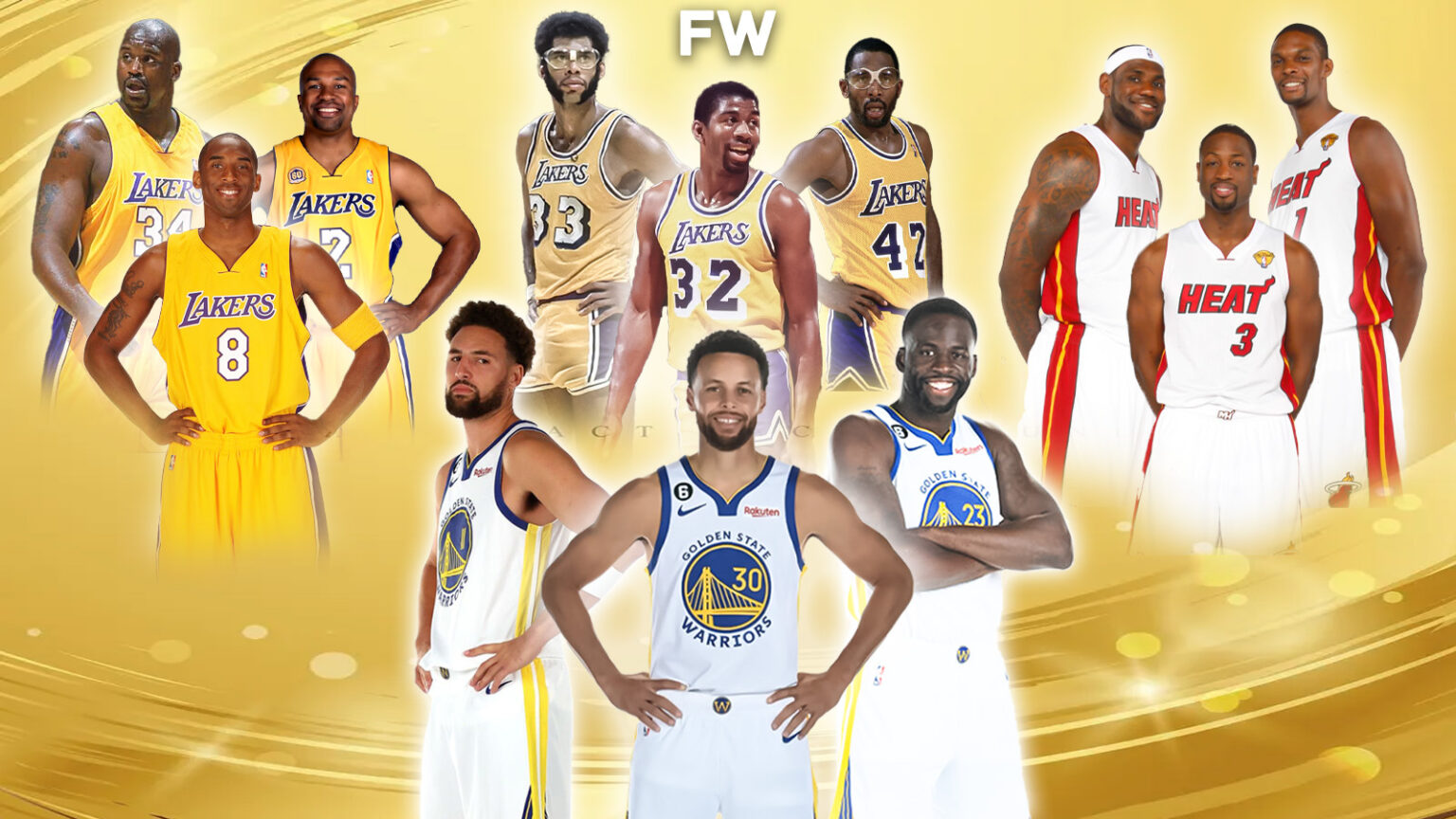 “Magic, Kareem, and James Worthy, I’m sorry. I’m probably going to pick Magic, Kareem, and James. You look at D-Wade, Bron, and Bosh. I wouldn’t necessarily pick them over us, but Bosh is 6’11, LeBron is 6’9, DWade is 6’4.