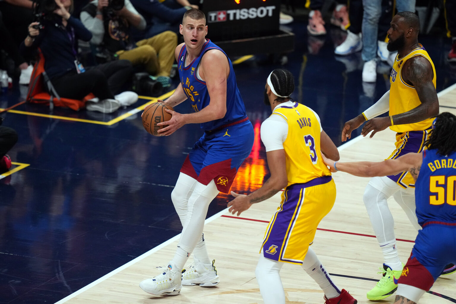 Nikola Jokic is dominating the Los Angeles Lakers in Game 1 of the Western Conference Finals, outrebounding the entire Lakers squad by 12 to 3 in the first quarter.
