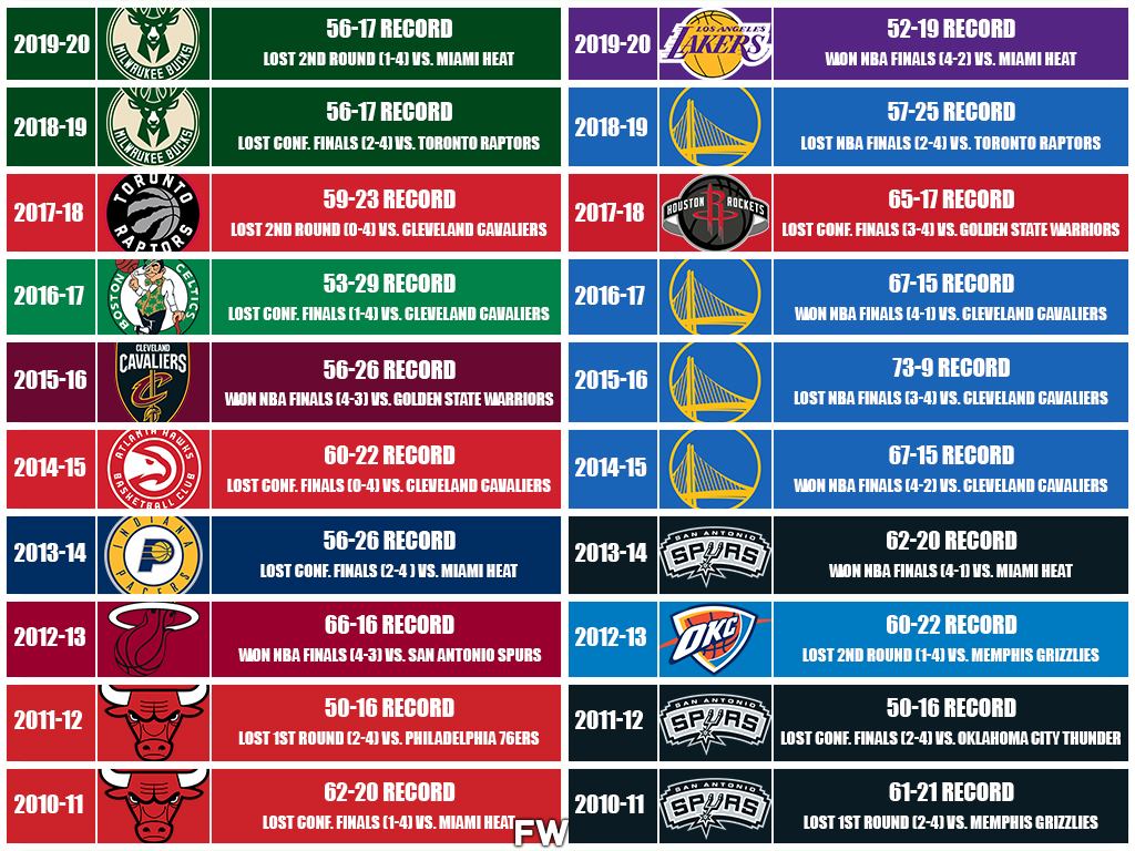 Over the last 20 years, here some interesting facts when it comes to teams winning the top seed. Ten No. 1 seeds have won championships, including three in the East and seven in the West. Out of our 40 possible teams, 18 of those No. 1 seeds have lost in the Conference Finals; however, only four teams with top seeds have lost in the NBA Finals. That means that over the last 20 seasons, teams that finish with a No. 1 seed and make the NBA Finals are 10-4 overall.