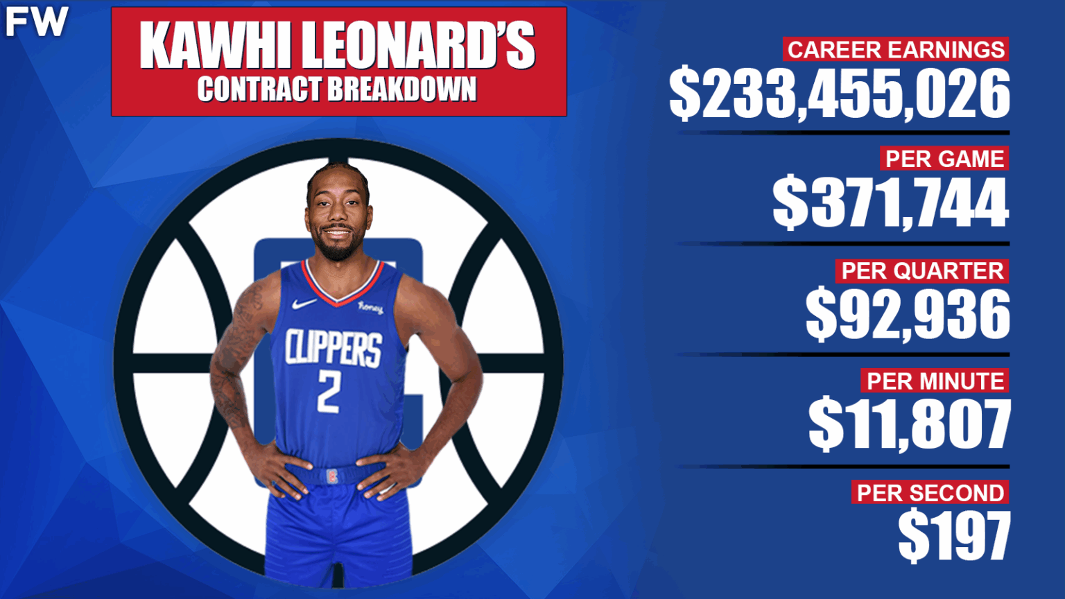 Every time we blink our eyes while watching Leonard play in his career, another $200, on average went into his pocket. If most Americans blinked 10 times, they would have enough to afford their rent for the month. It really puts things into perspective when you compare Leonard’s ridiculous salary to the life of an average human being.