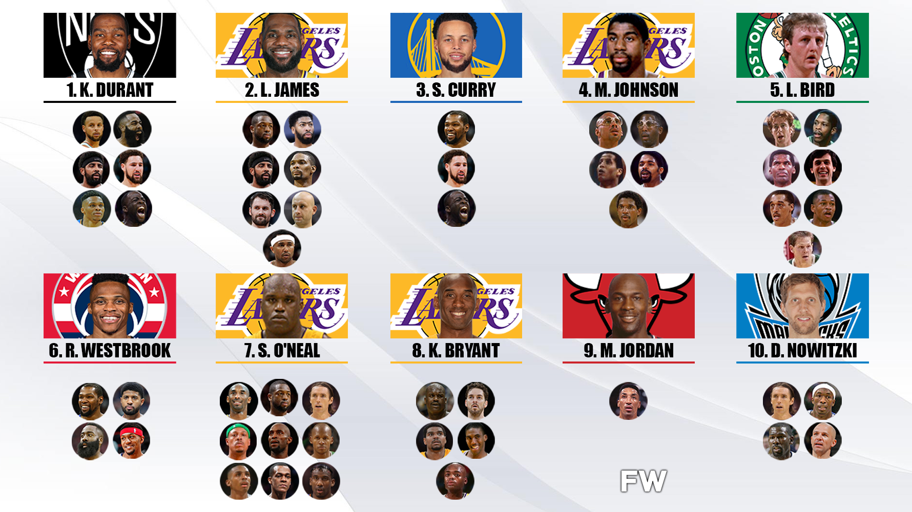 The greatest point guard to have ever lived, Magic Johnson played with 5 All-Star teammates. But of those 5, 2 of them are top-50 talents. More specifically, Magic played with arguably the most successful basketball player to have ever lived in Kareem Abdul-Jabbar. Kareem made the All-Star Team every single year he played alongside Magic Johnson, even at the ages of 40 and 41.