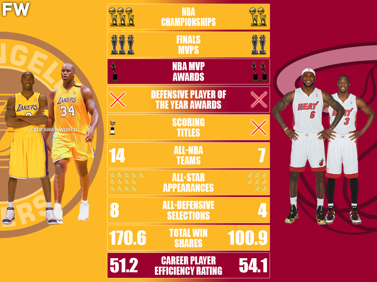 It is time to declare the winner between two iconic duos: the Lakers and the Heat duos that effectively changed the game during their eras. Taking into account combined achievements and personal success during their times in their prime together (excluding the 46 games Wade played in Cleveland), here is the ultimate comparison between Kobe Bryant and Shaquille O’Neal and LeBron James and Dwyane Wade.