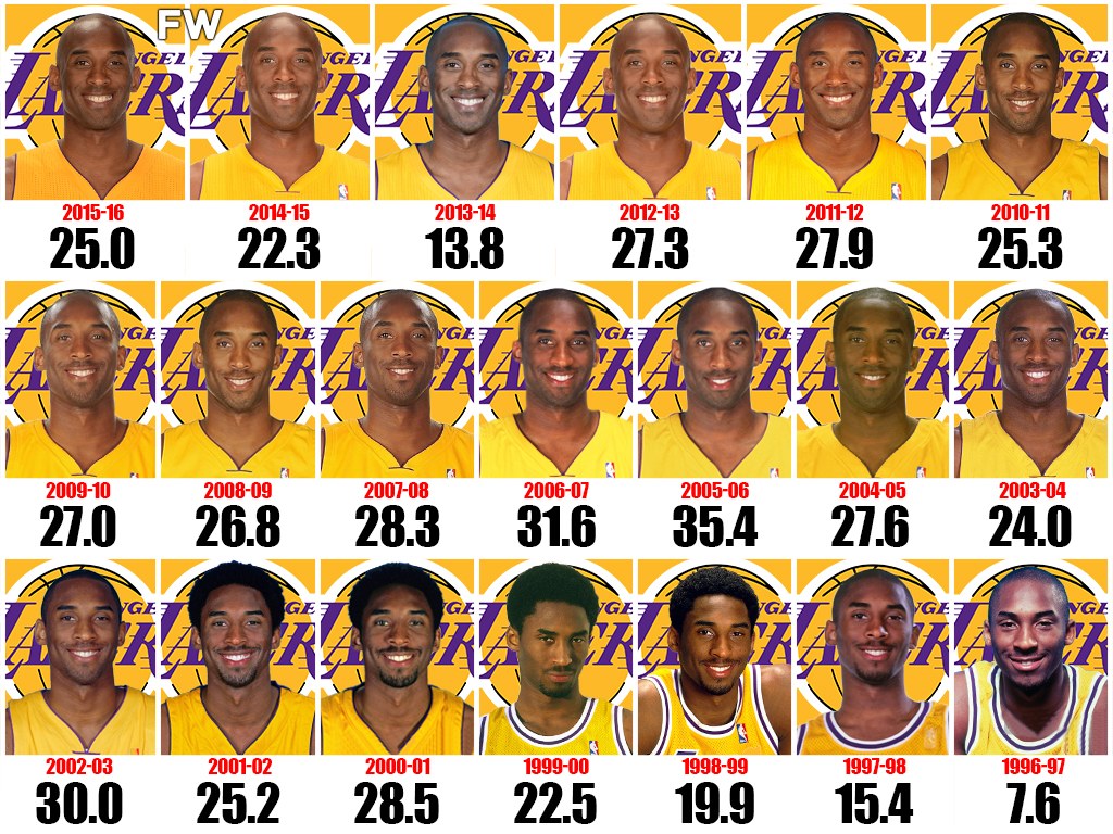 Here are Bryant’s season-by-season points per game averages.