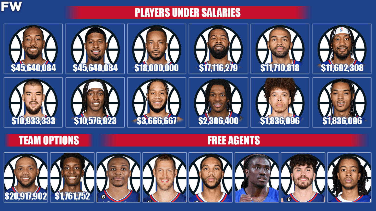 Overall, the money is tied up for the three best players on the team, while role players such as Morris, Covington, Batum, and Zubac are making decent money as well. It is clear what the Clippers’ core is made up of, and they are going all-in with a host of two-way players that are very talented.