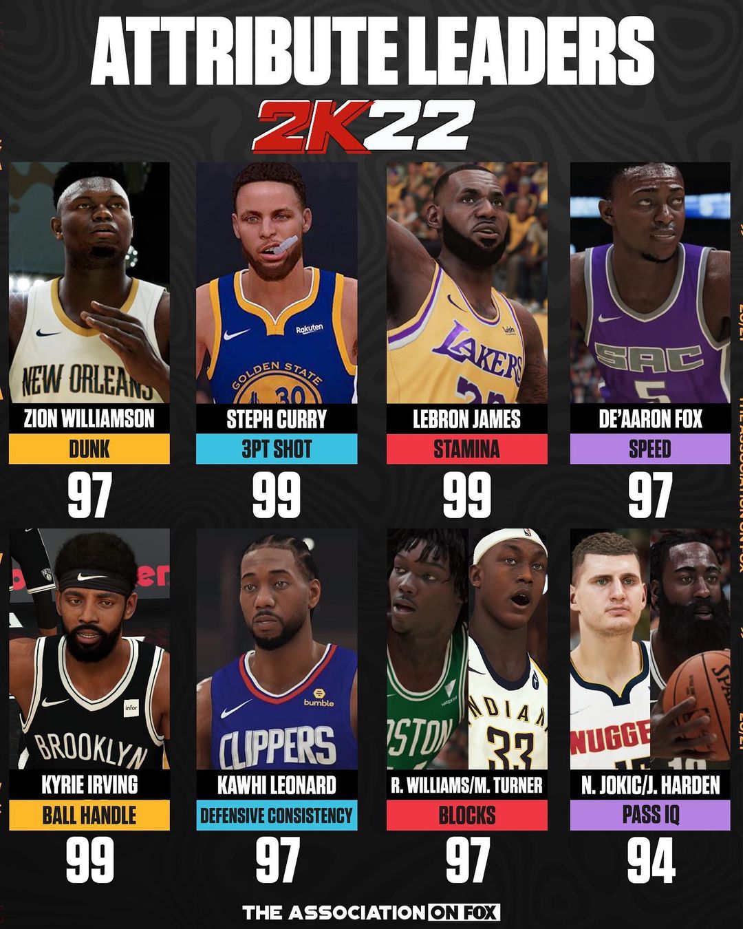 As for blocking, Robert Williams and Myles Turner have the highest rating with 97, and Nikola Jokic and James Harden lead the game in passing IQ with 94. Zion Williamson has the best dunking attribute with 97, and De’Aaron Fox is the fastest player in the game with 97.