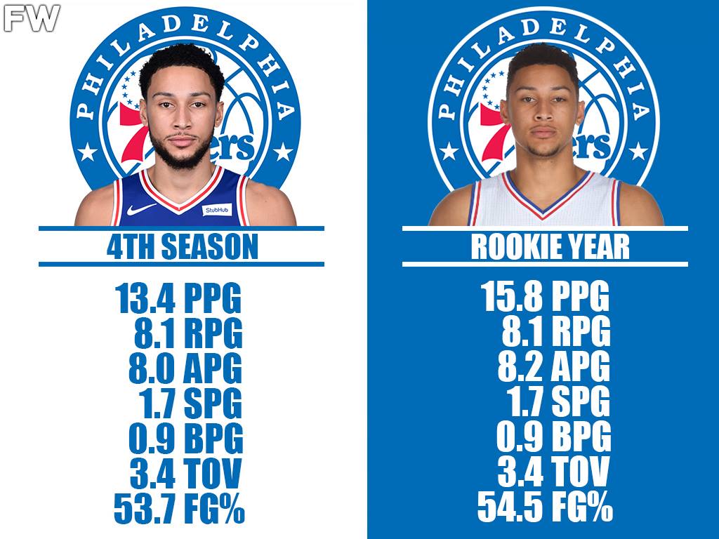Instagram account “Hoops” shared a very curious pic in recent days, showing how Ben Simmons’ numbers have decreased this season compared to his rookie campaign in the NBA. Back in the day, Simmons averaged 15.8 PPG, 8.2 APG and 8.1 RPG, enough to get him the Rookie of the Year award.
