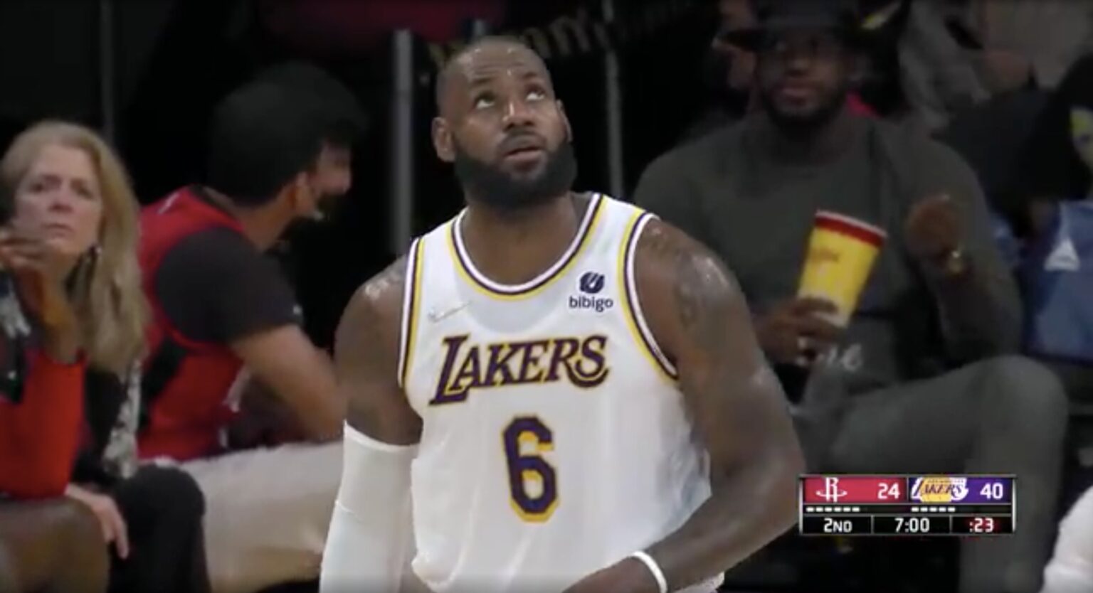 At one point in the broadcast, cameras caught a glimpse of LeBron James running back. But behind him, in the stands, was a fan that looked almost identical to LeBron James, sitting and eating popcorn, watching the Lakers beat the Rockets at Staples Center.