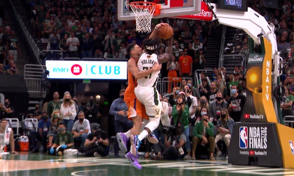 With less than four minutes in the 4th quarter, Jrue Holiday took off on a fast break; as he goes for the layup, Booker wraps him up, fouling the point guard. However, referees didn’t blow the whistle, leaving Book to play the rest of the game for free.