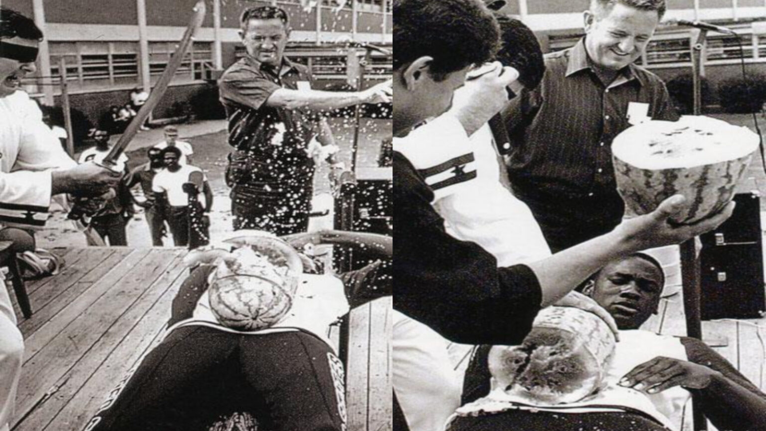 In the stunt, Jordan would hold up watermelon to his midriff, as Crain would be blindfolded before taking his samurai sword and slice the watermelon in half. As Crain took the samurai sword to slash the watermelon, he put a little more force in his slash, but Jordan’s positioning avoided him an injury. But MJ wasn’t as lucky the second time. As the audience saw the watermelon’s chunks fly around, Crain took off his blindfold to see that Jordan’s U.S All-Stars shirt had a slight tear.