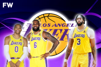Russell Westbrook And LeBron James Smile On The Bench While Anthony Davis Looks Disappointed