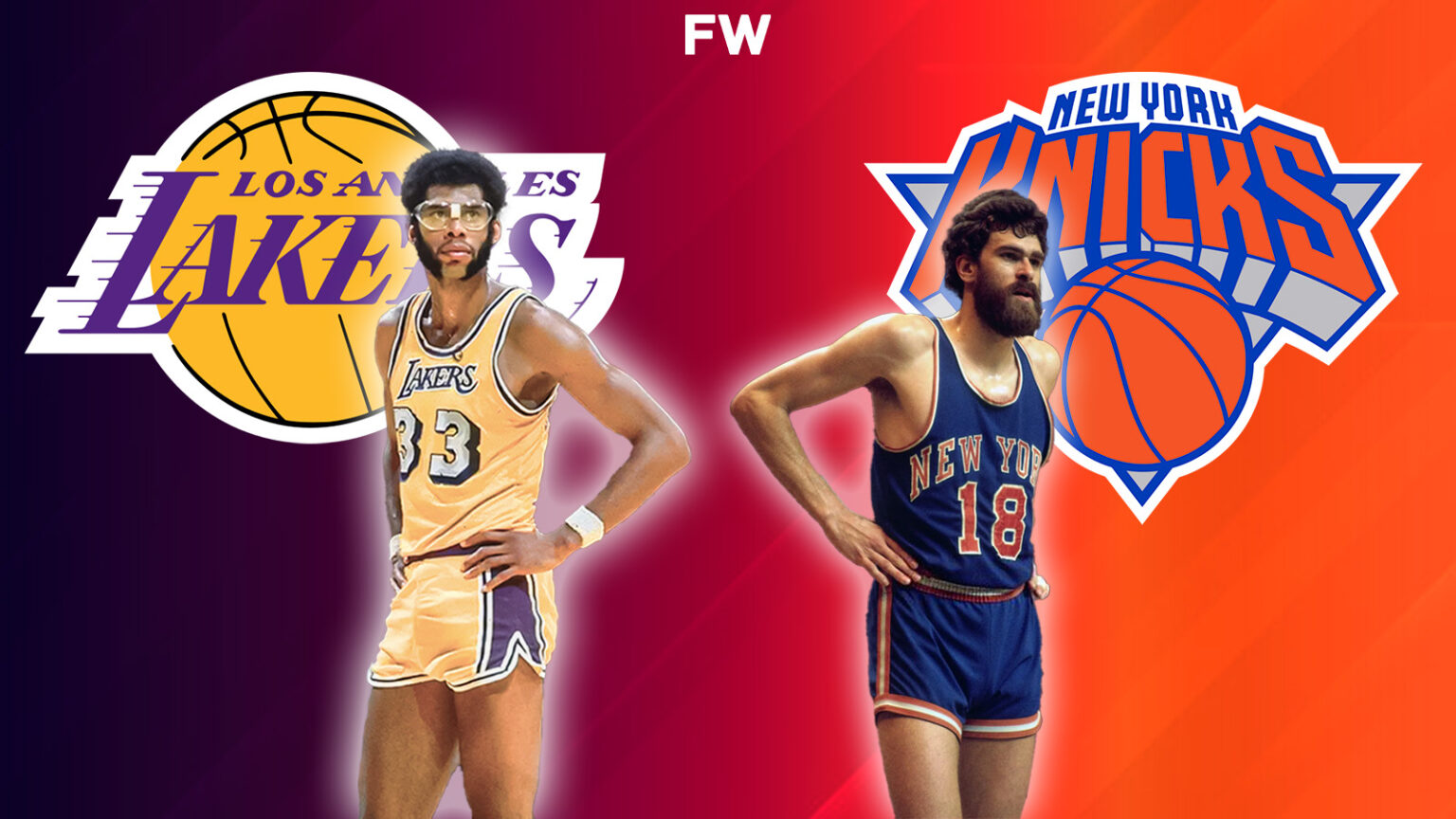 Kareem Abdul Jabbar being guarded by Phil Jackson, I think the image goes quite hard