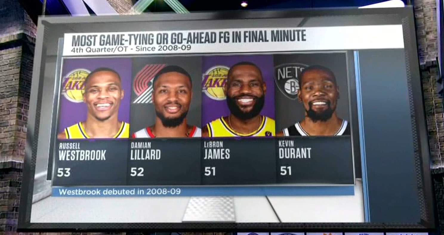 Russell Westbrook Has The Most Game-Tying Or Go-Ahead Shots In The Final Minute Among All Active NBA Players Since 2008-09