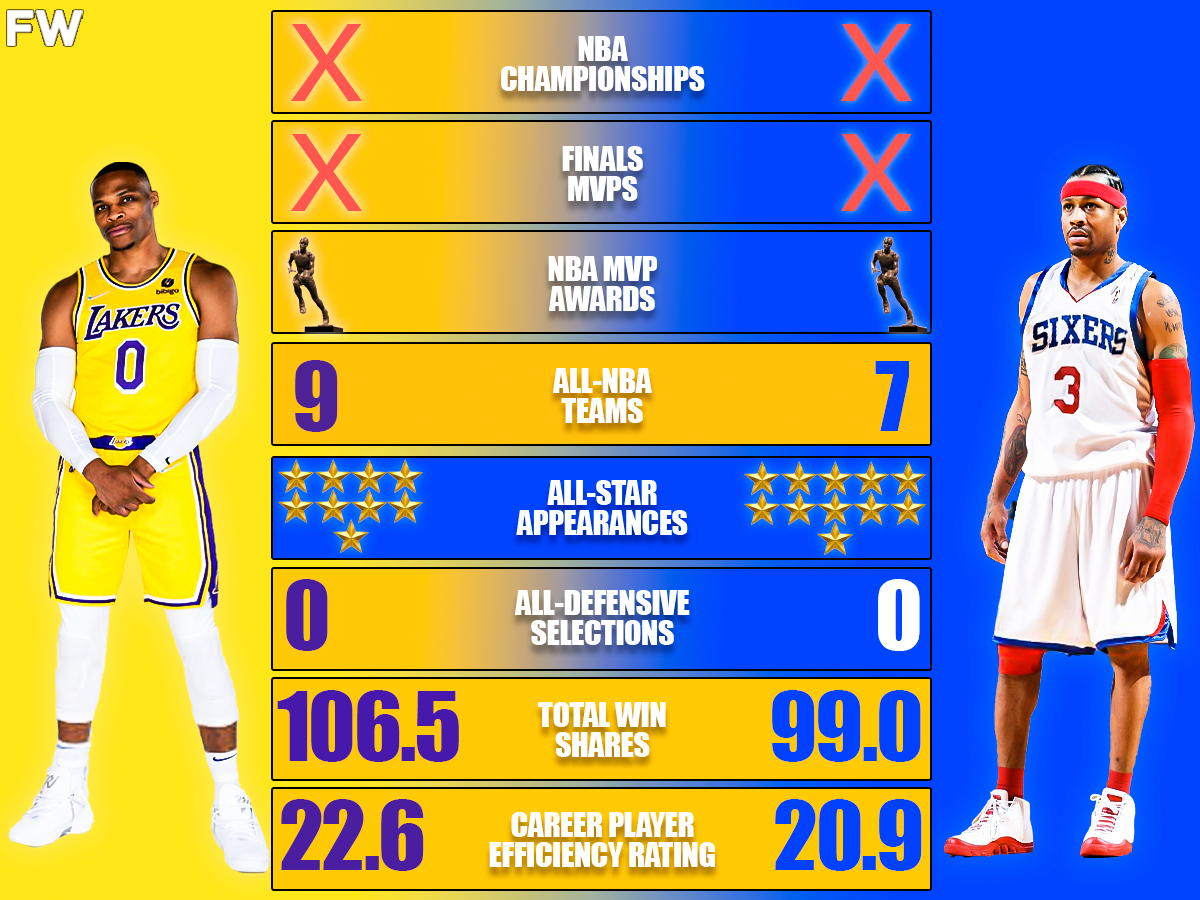 Allen Iverson is one of the greatest scorers ever, while Russell Westbrook has yet to convince the masses that he is the best point guard of his time. To his credit, the former Oklahoma City Thunder star managed to stay effective for a long time, because he is an elite athlete who could also use his size to have an impact. That meant Russ could accumulate more All-NBA selections compared to a miniature guard who is limited in terms of size. But overall, Russell Westbrook has a 3-1 career advantage in major categories including All-NBA Team selections and advanced statistics including win shares and PER.Â