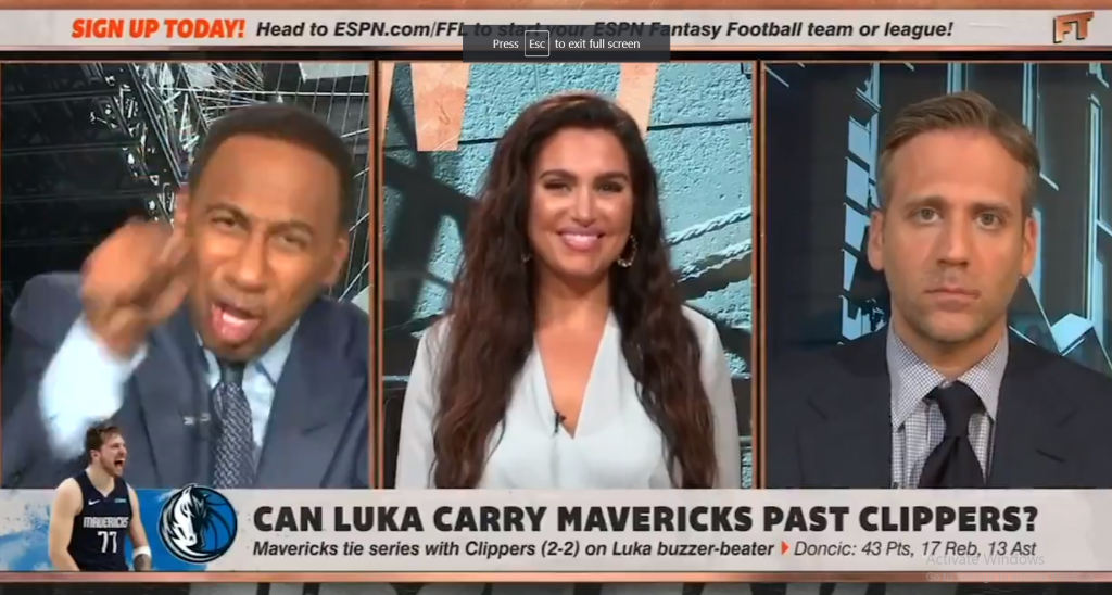 Max: “Don’t let Doncic beat you… Stephen A., you’re acting like nobody else could beat you. Yeah, double Doncic, make sure Kahwi doesn’t switch off on him, all that stuff. The bottom line is, they got a team full of shooters that will make you pay.”