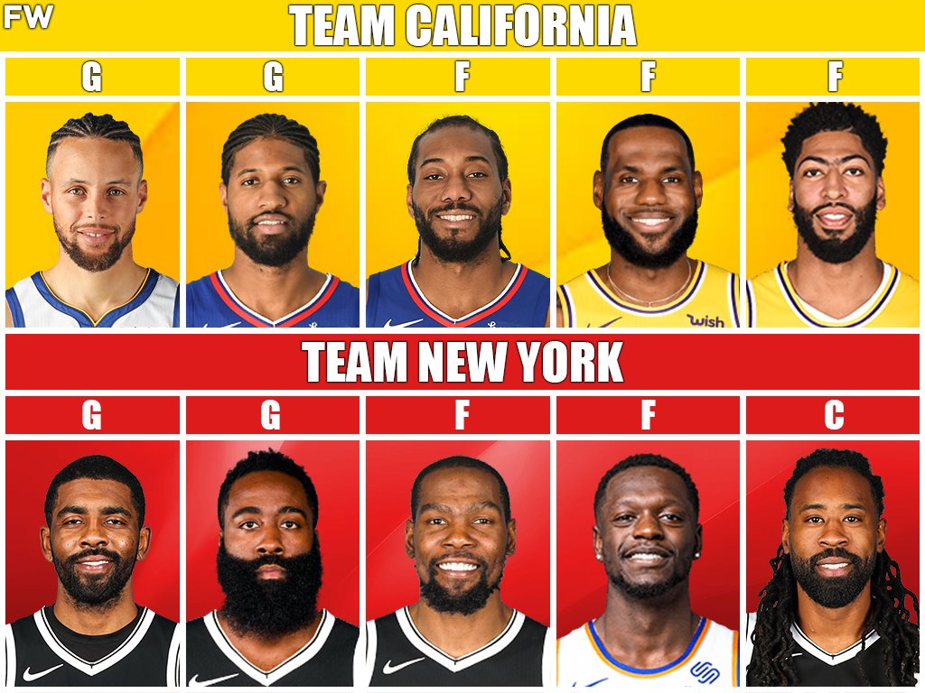 Team California vs. Team New York: Curry, LeBron, Davis vs. Irving, Harden, Durant