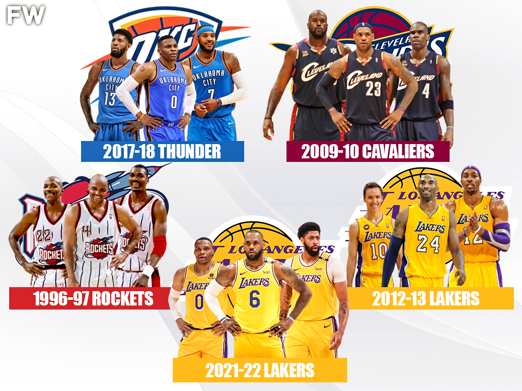 The 2017-18 Thunder had one of the premier trios in the league but lost in the First Round and the 2012-13 Lakers brought in Dwight Howard and Steve Nash to team up with Kobe and Pau, yet couldn’t make it to the Second Round of the playoffs. The 1996-97 Rockets were one of the league’s first superteams but lost in the Western Conference Finals.