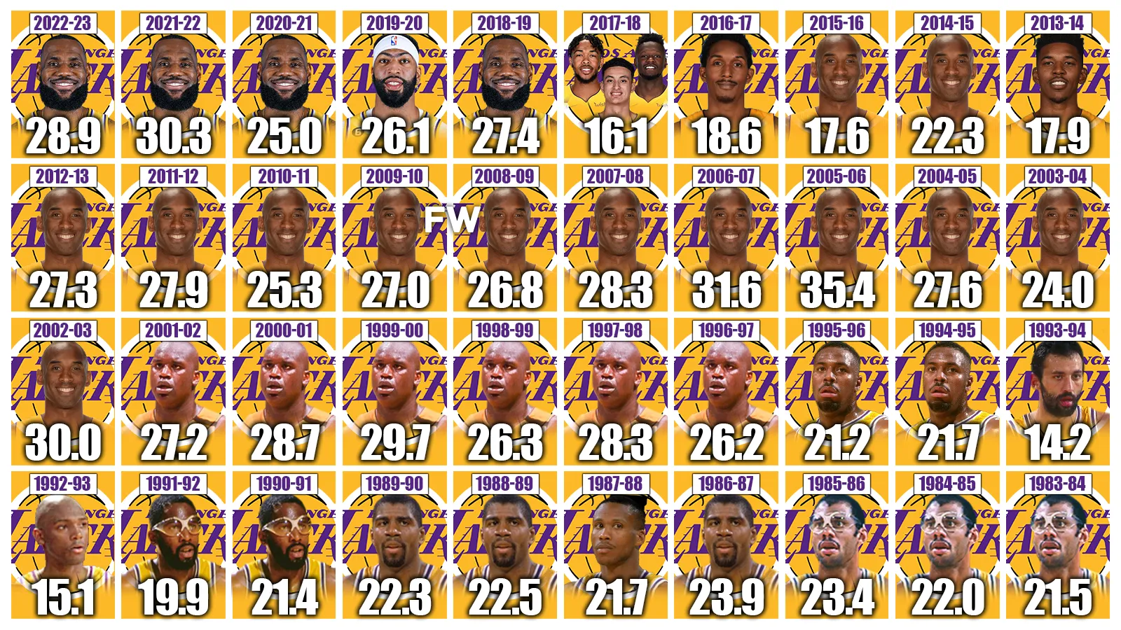 As we venture through these 40 seasons, take note of the consistency from these stars as we also mention their contributions to other parts of the game but, more importantly, how their scoring impacted success on a team level. As far as legendary franchises go, the Lakers may not be alone, but they are certainly at the top of the NBA hierarchy, so there was simply no better way to kick this series off.