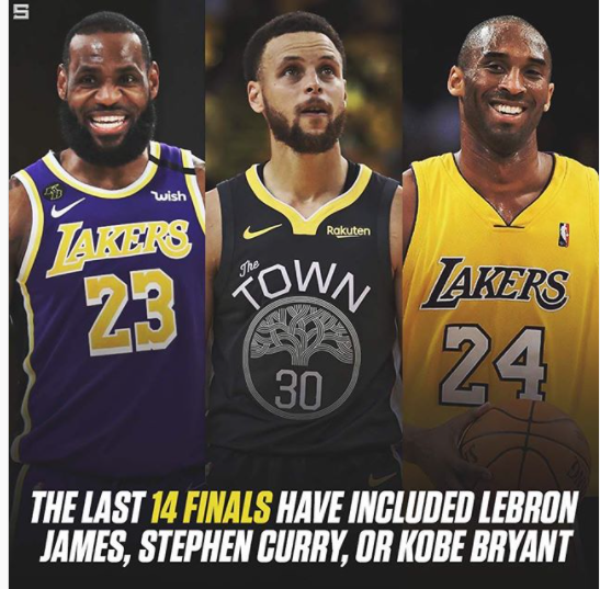 Reading: The Last 14 NBA Finals Have Included LeBron James, Stephen Curry, Or Kobe Bryant