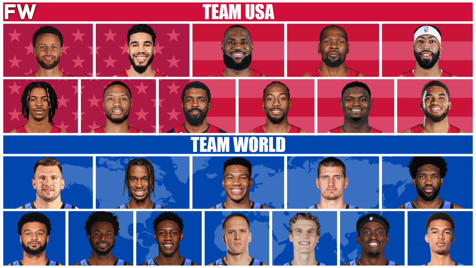 Team World Starting Lineup: Luka Doncic, Shai Gilgeous-Alexander, Giannis Antetokounmpo, Nikola Jokic, Joel Embiid