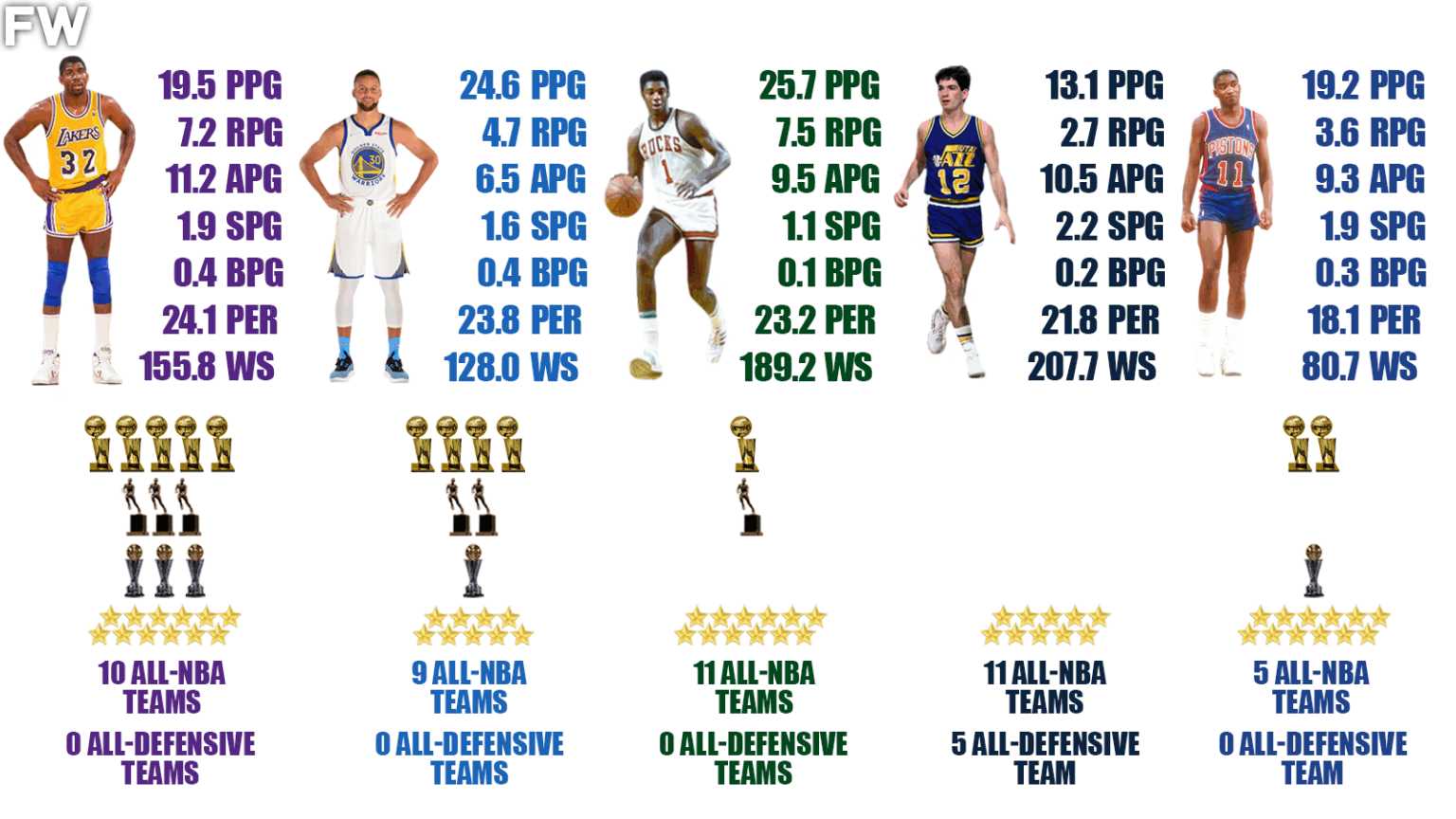 The only other player here to win an MVP in his career was Oscar Robertson. He was named the MVP in 1964 averaging 31.4 PPG, 9.9 RPG, and 11.0 APG which led the NBA. His team would finish with a 55-25 record on the season but fall to the Celtics in the Eastern Division Finals. As for Thomas and Stockton, neither were ever awarded with an MVP but both had numerous seasons that warranted consideration.